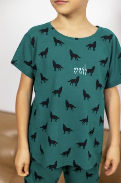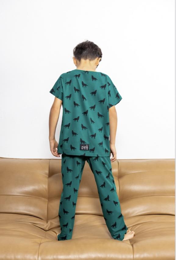 Patogi ir stilinga vaikiška pižama, puikiai tinkanti ramiam miegui ir jaukiam laikui namuose. Komplektą sudaro trumpomis rankovėmis marškinėliai ir ilgos kelnės. Pižama pasiūta iš minkšto, kvėpuojančio audinio, kuris užtikrina komfortą visą naktį. Žalios spalvos audinį puošia žaismingi vilkų motyvai, suteikiantys drabužiui išskirtinumo ir patrauklumo vaikams. Laisvas kirpimas nevaržo judesių, todėl vaikas jausis patogiai tiek miegodamas, tiek žaisdamas namuose. #pizama#mertaiteipizama#patogipizama